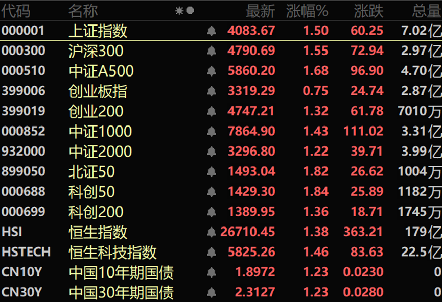 今日三大指数集体收涨,沪指高开高走,再创十年新高。量能持续放大,沪深两市成交额2.81万亿,较上一个交易日放量2602亿。