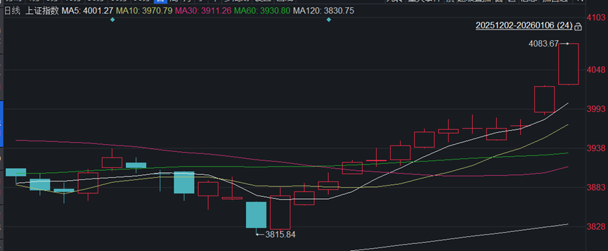 继昨天重新站上4000点大关后,今天更是把本轮行情的高点4034点一举跃过,感觉市场做多热情在2026年开年两天被进一步点燃了。