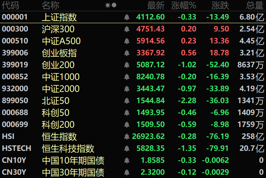 三大指数涨跌不一,沪指盘中一度跌破4100点,创业板指午后探底回升。沪深两市成交额2.91万亿,较上一个交易日缩量1.04万亿。