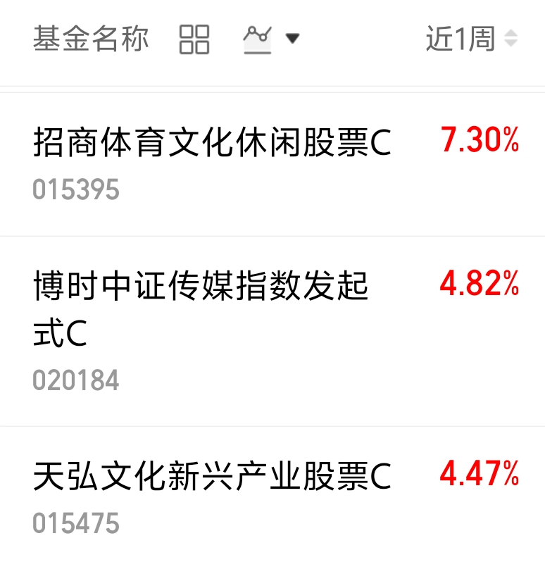 大盘昨天回暖上涨,近期阿能比较大,Ai应用最近表现还不错呢,$招商体育文化休闲股票C$ 近一周涨了7.30%,太给力了,长期看好这个方向!