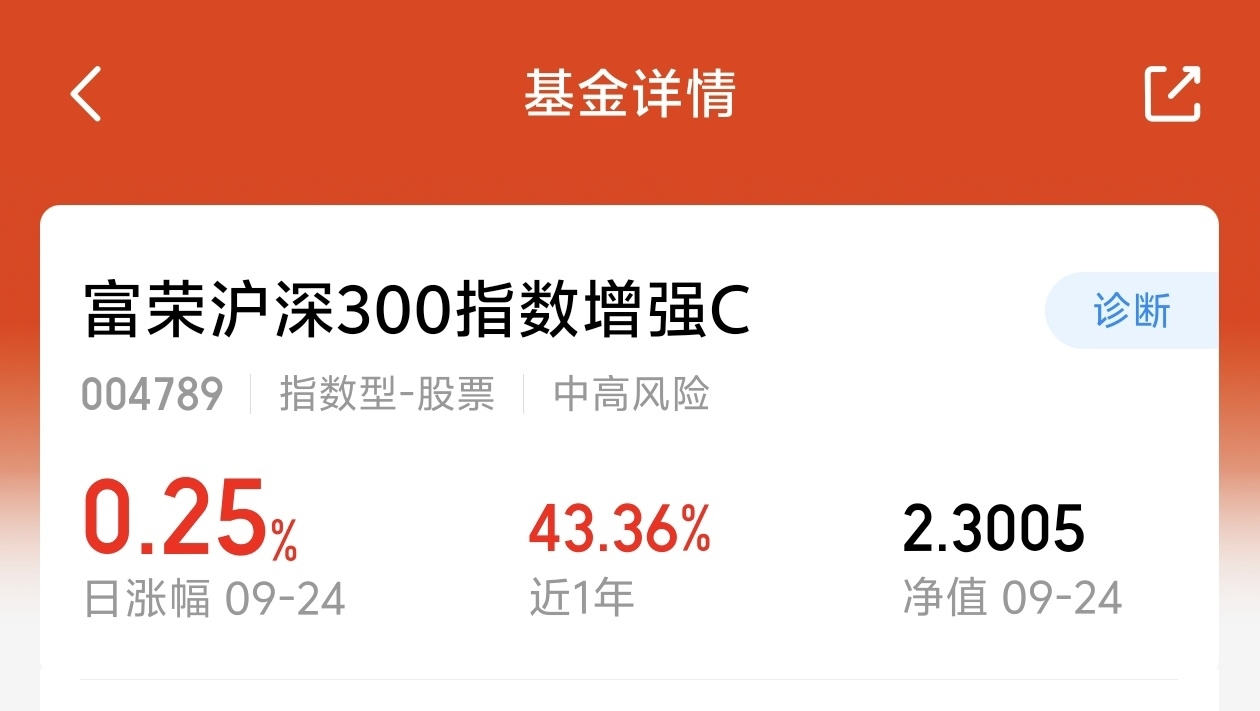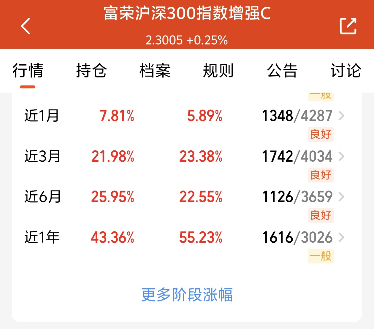 $富荣沪深300指数增强C$ 到目前为止估值上涨了1.07%,今晚吃大肉。基金历史业绩表现的也是非常的优秀。近一个月上涨了7.81%,近三个月上涨了21.98%,近一年的收益率高达43.36%,盈利能力强。各阶段业绩在同类基金排名领先,收益率远超同类平均。基金精准的跟踪沪深300指数,综合费率低。随着经济的逐步回稳向好,企业盈利能力逐步的增强,大量的资金顺周期流入沪深300指数,将迎来新一轮的上涨。同时沪深300覆盖行业多,降低了单一行业波动的风险,同时能享受不同行业带来的发展机遇。当前沪深300市盈率处于较低水平,配置价值高,期待后期收益,坐等吃肉。
