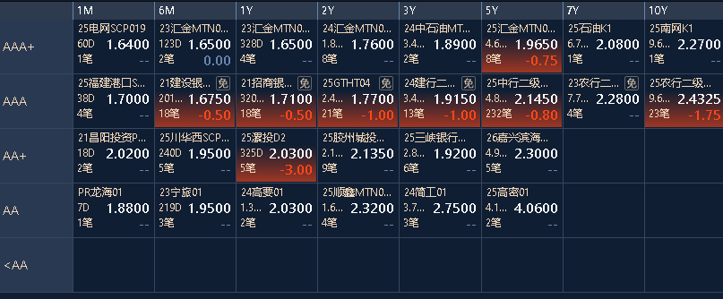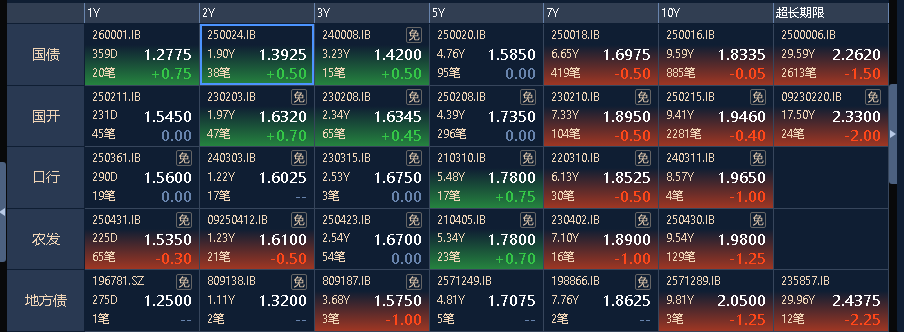 早盘因权益走强涨幅有所收窄,但午后随着沪指走弱,且避险情绪持续升温,30年国债收益率带动10年期、7年期国债下行(同时今天发行的7年期国债加权中标利率为1.6733%),30Y国债2500006收益率一度触及2.25%,而短端品种收益率小幅上行。