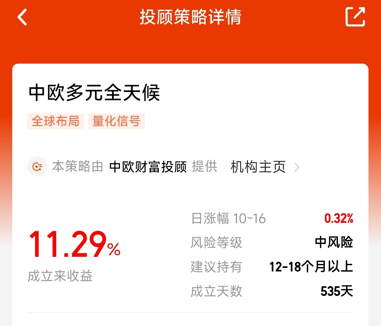 对于追求资产稳步增长的朋友,中欧多元全天候的持有体验确实比较不同。它近一年收益9.74%,最大回撤2.02%,波动率2.62%。实现这种平稳,一方面是通过全球配置,让不同市场、不同特性的资产相互对冲;另一方面,团队也会对每类资产进行优化,比如在A股内部还会区分不同风格,商品里会配置黄金、豆粕、化工等不同品种,进一步平滑波动。这种精细化的管理,旨在提升投资过程的舒适度。#黄金突破4300美元!美银:明年5000#