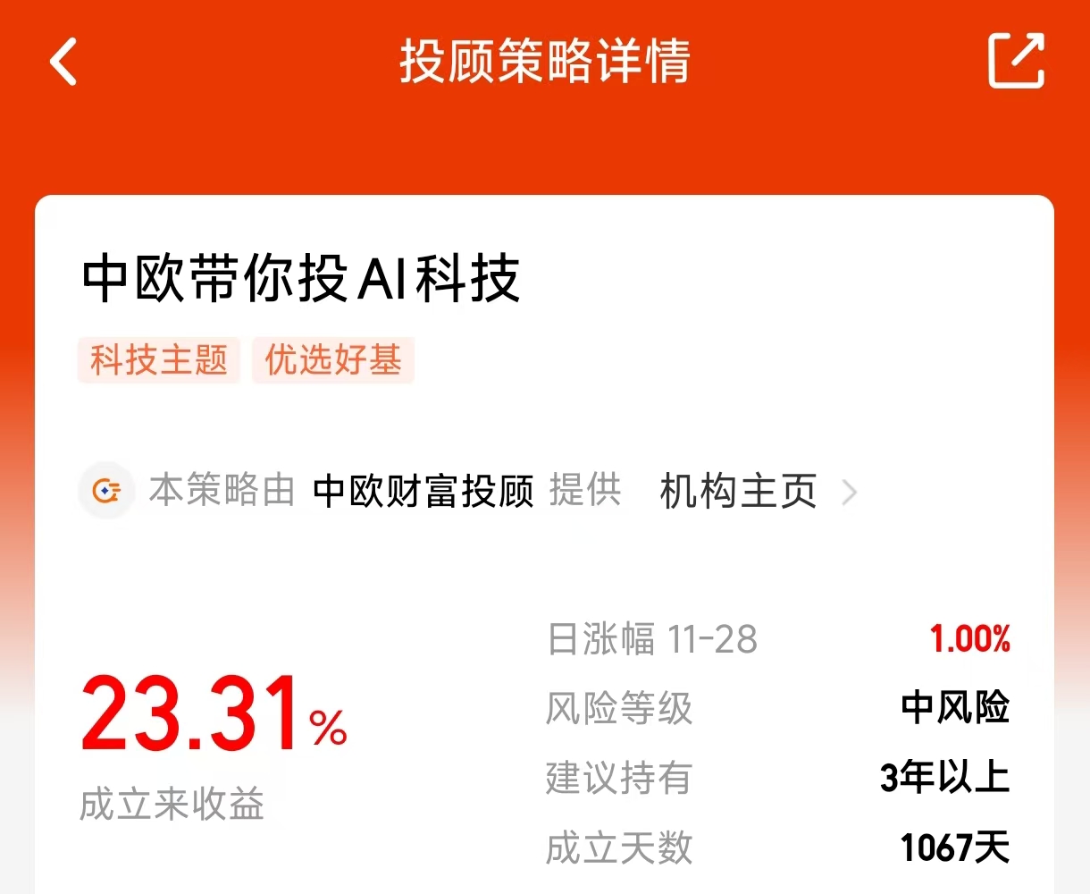 最近科技板块的走势像是困境反转,上周刚经历一波回调,这周算力链又领涨。这种反复震荡的行情下,即使长期看好AI的潜力,但单独持有某只科技基金确实容易心态失衡。我自己之前也常纠结该何时调整仓位,直到尝试了“中欧带你投AI科技”这个投顾组合。它最大的特点是由专业投顾团队帮你配置一篮子科技主题基金,覆盖AI、半导体、港股互联网等多个方向,不仅分散风险,还会根据市场信号动态调仓。比如今年团队在3月提前布局了数字经济基金,7月又增加了机器人主题,这种主动管理让组合近半年实现了46%的收益率,相比业绩基准高出8个百分点。对于想参与科技行情但缺乏经验的投资者,这种“打包式”布局既能跟上趋势,又避免了择时难题。#12月基金投资策略#