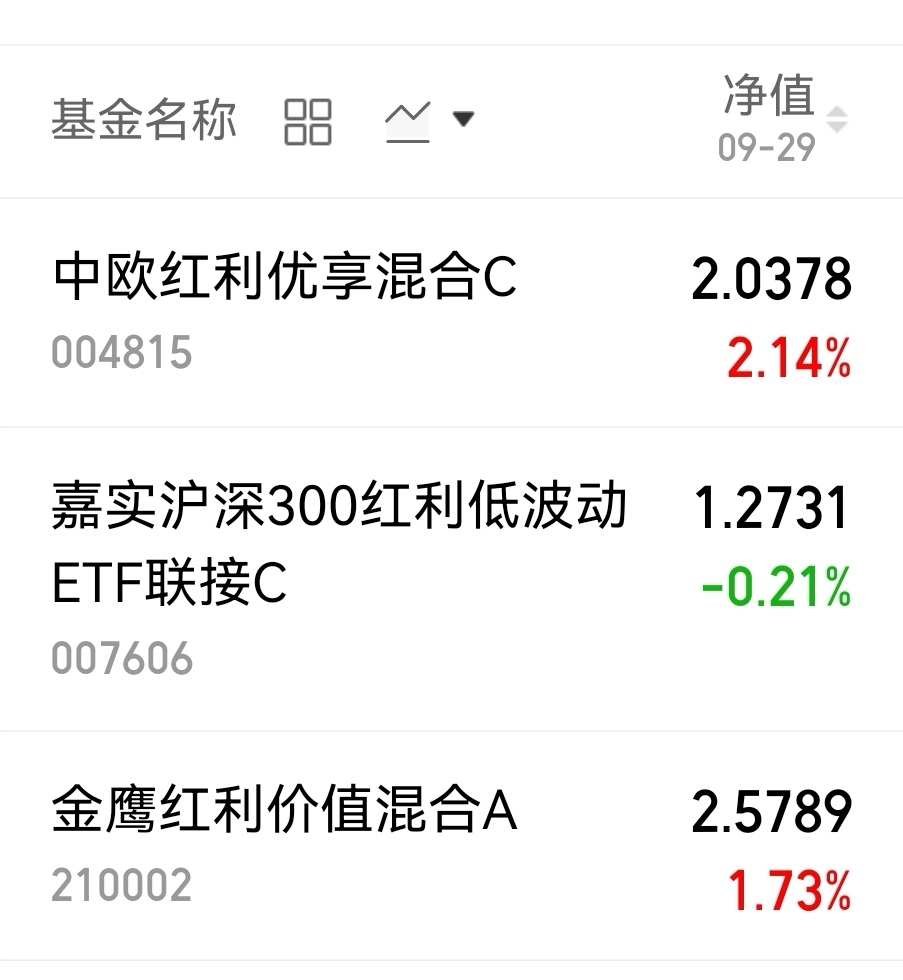 $中欧红利优享混合C$ 这只基大涨2.14%,弹性还不错,混基业绩也更好,有闲钱就可以加起来。