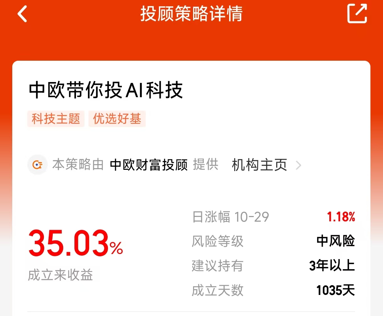 基金的投资需兼顾趋势与估值,但个人难以全面跟踪。中欧投顾团队的策略会定期分析市场变化,而“中欧带你投AI科技”也延续了这种动态管理思维。例如,组合在AI板块估值偏高时提示相关基金的风险,并通过增加低相关性资产平衡波动。这种持续优化使组合在近一年实现56%的收益,且波动相对可控。如果你认为科技是长期赛道,但希望避免大起大落,此类注重体验的投顾服务或许更适合你。#英伟达市值突破5万亿美元!啥信号?#