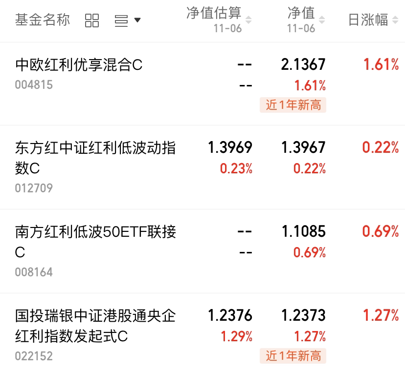 现在的氛围和之前不一样了,之前只是科技类涨,今天红利板块也跟着涨起来了,毕竟个股涨跌各半,许多资金还是选择了防守。$中欧红利优享混合C(OTCFUND|004815)$上涨1.61%,$东方红中证红利低波动指数C(OTCFUND|012709)$上涨0.22%,$南方红利低波50ETF联接C(OTCFUND|008164)$上涨0.69%,$国投瑞银中证港股通央企红利指数发起式C(OTCFUND|022152)$上涨1.27%。