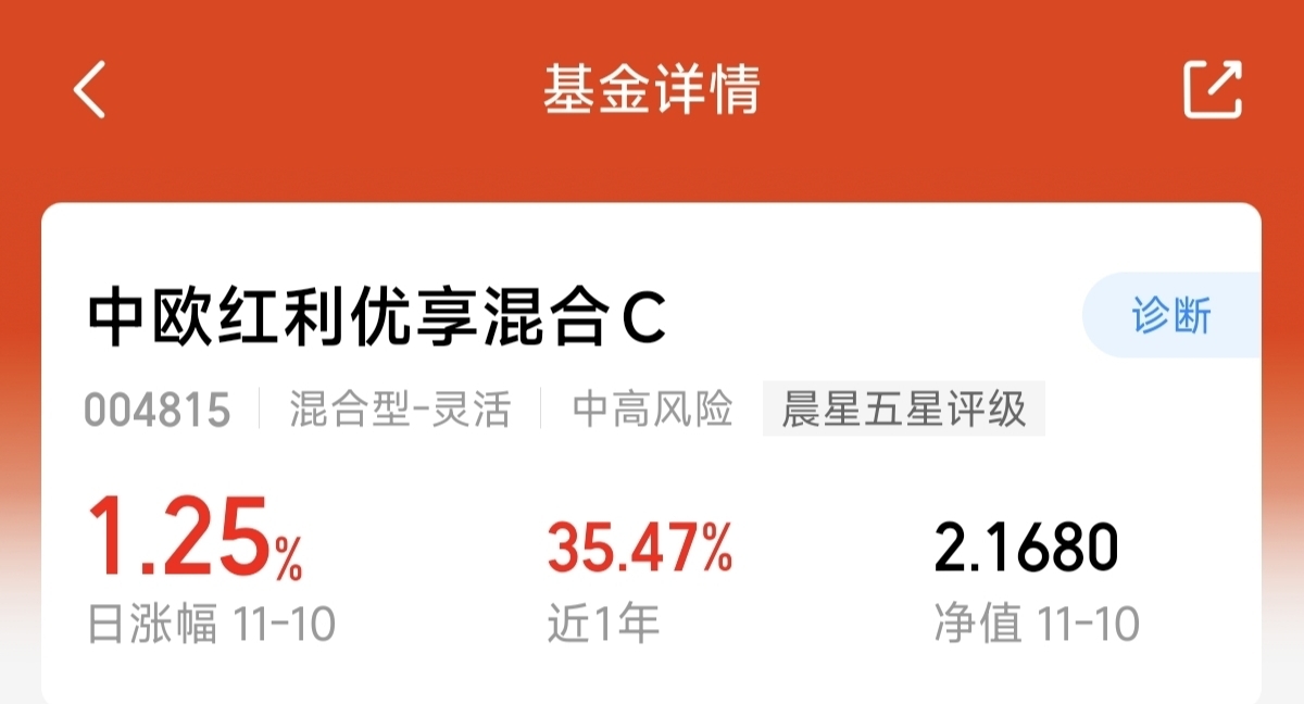 创新高了。今天市场出现分化了。可是红利还是做到了稳定上涨,$中欧红利优享混合C$ 是主动的红利基金。今日涨幅1.25%。这个爆发力是真的强啊!近一年涨幅35.47%。每个月都在创新高。主动的红利基金。长期超额的收益能力强。期待继续创新高。