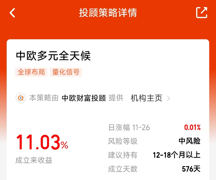 面对市场不确定性,如何平衡参与机会和控制波动是个问题。中欧多元全天候组合近一年收益9.2%,最大回撤2.02%,波动率2.83%,提供了一个思路。它通过量化模型,将资金分散配置于全球范围内的股、债、商等各类资产,其中权益和商品等风险资产仓位约占35%。这种配置不是固定的,而是会根据市场环境动态调整权重,目的就是希望在不同环境下都能有不错的表现。桥水的全天候策略很有名,国内这个策略也挺成熟,额度充足。大家在天天基金APP里,找到“投顾管家”,进入后就能在“三笔钱投顾”板块看到这个组合。#3800点的A股值得加仓吗?#