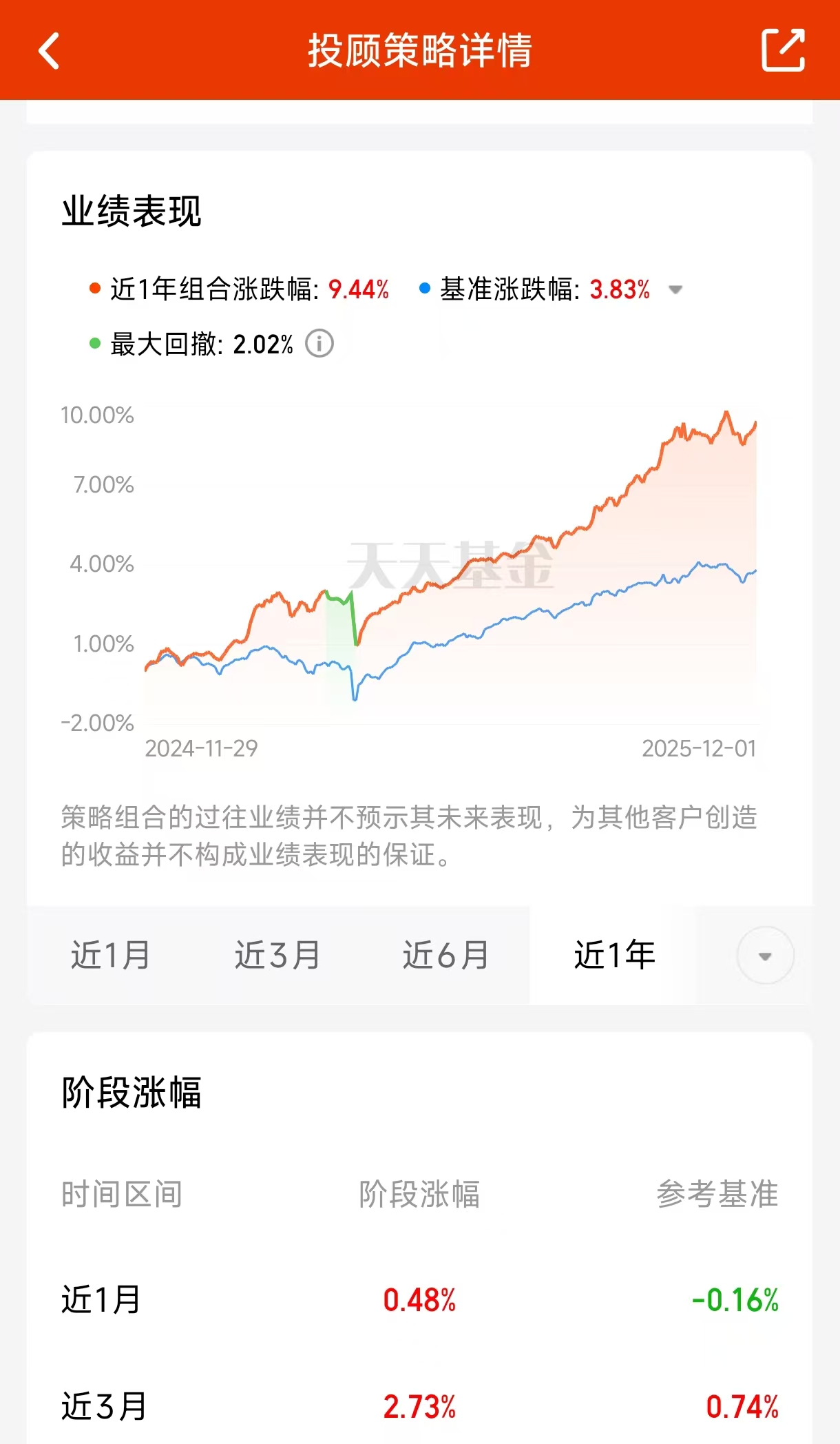 近期市场波动,传统固收增强产品回撤显著,中欧多元全天候近一年收益9.44%,最大回撤2.02%,波动率2.82%,体验较舒心。在高估值市场下,传统策略可能波动较大,而中欧多元全天候通过全球配置(涵盖中外股、债、商品等七类资产),利用资产间低相关性对冲风险。它的架构参考桥水全天候,但更注重本土化实践,固收为盾,多元为矛。组合在投顾管家的“三笔钱投顾”板块可找到,额度充足,适合希望稳步积累的人。#12月你看好哪条投资主线?#