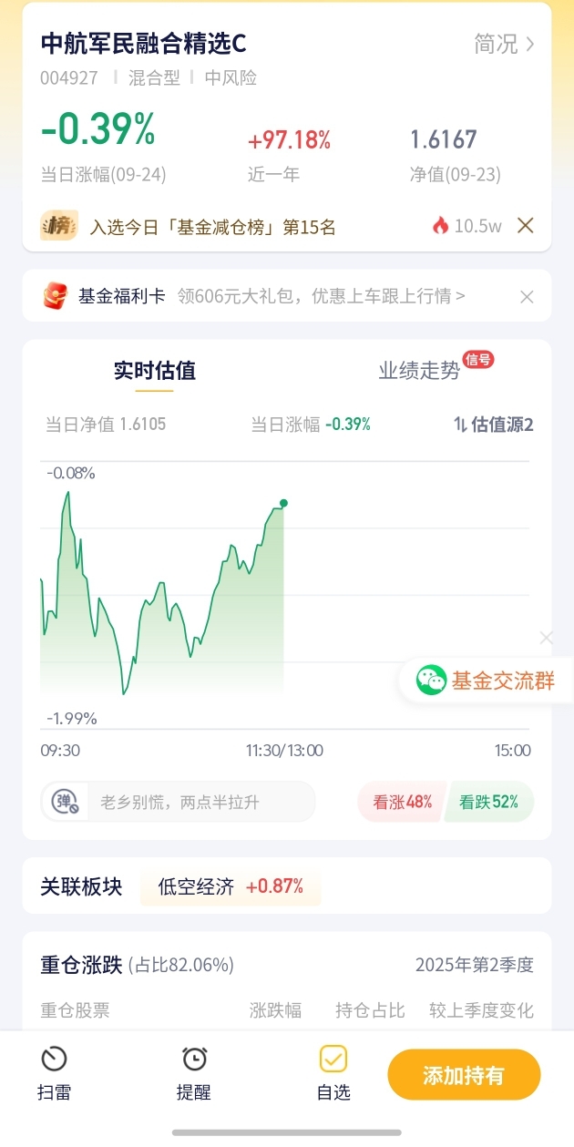 9. 中航军民融合精选C:昨天跌1.14%,今天还跌0.39%,这只基今天有点拉胯,不过军民融合长期看有潜力,再等等看它发力。