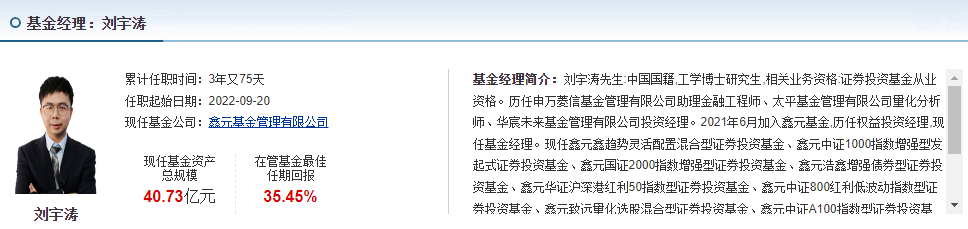 基金经理是刘宇涛,他在量化投资和基本面分析方面有着深厚的经验和专业背景。刘宇涛自2015年起就一直活跃在基金管理行业,曾在多个知名基金公司担任重要职务,积累了丰富的投资经验。他擅长通过结合量化分析与基本面研究,来筛选出市场中具备长期成长潜力和稳定收益的优质股票。