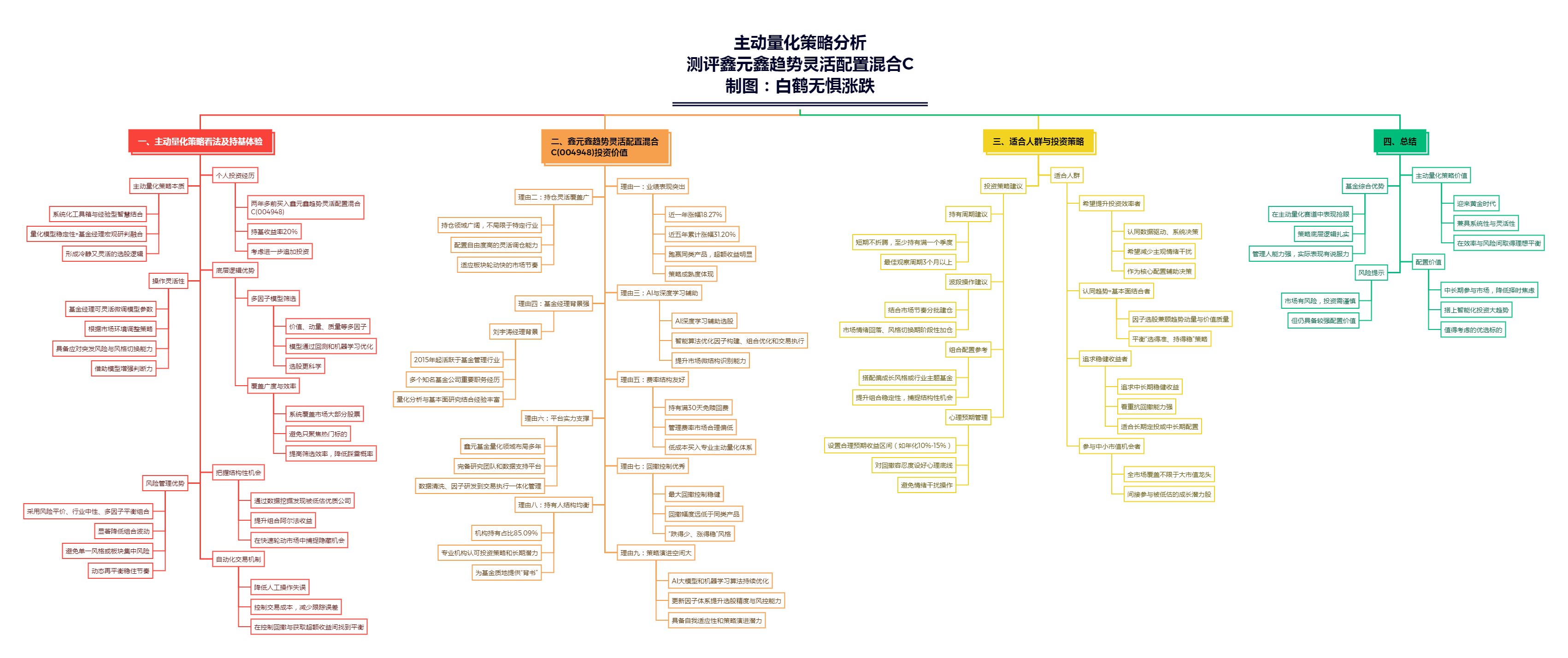 接下来白鹤君就和大家聊聊自己对于主动量化策略的看法,并结合两年多以来的体验,深度测评下鑫元鑫趋势灵活配置混合C(004948)。文章有点长,这里白鹤君也是做了个思维导图,方便大家整理思路,可以点开放大了看下的。