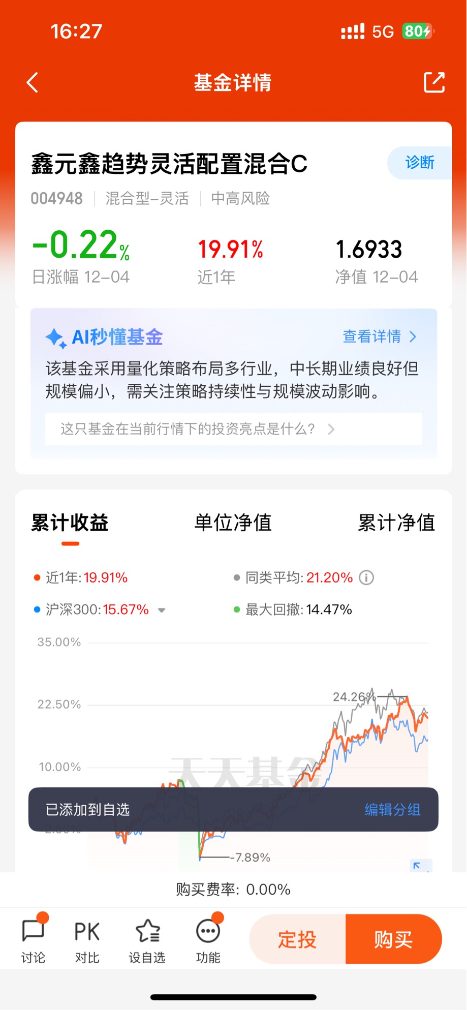 对于年末配置,我也打算继续持有并适当加仓鑫元鑫趋势灵活配置混合C。毕竟在当前市场环境下,这种兼具纪律性和灵活性的策略,既能帮我守住全年的收益成果,又能为明年的行情做好铺垫。也期待这只基金能继续发挥双策略优势,在震荡市中走出更稳健的净值曲线。