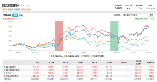 代表产品是鑫元鑫趋势,今年以来业绩为21.50%,近三年业绩为26.11%,鑫元鑫趋势从在管以来,三年超越了万得偏股混合型基金指数,超额主要是表现在前两年下跌的一个阶段。基本上鑫趋势比偏股混合型基金指数在下跌时跌的要少一点,而在上涨阶段,像今年牛市阶段基本上也能跟得上这类产品指数。