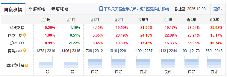 从阶段收益表现来看,基金在不同时间维度上均取得了正收益。近1个月收益率为-1.10%,近3个月收益率为4.43%,近6个月收益率为19.59%,近1年收益率为19.17%,近2年收益率为28.94%,近3年收益率为23.92%。特别值得关注的是,2025年以来基金表现优异,今年以来收益率达到21.36%,在同类基金中排名较为靠前。