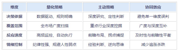 在投资决策过程中,量化与主动形成了互补机制。量化模型提供客观的数据支撑和纪律性筛选,避免了主观情绪对投资决策的干扰;主动管理则发挥人的主观能动性,通过深度研究挖掘量化模型可能遗漏的投资机会,规避价值陷阱,博取期权弹性。这种结合既保证了投资的科学性,又不失灵活性。