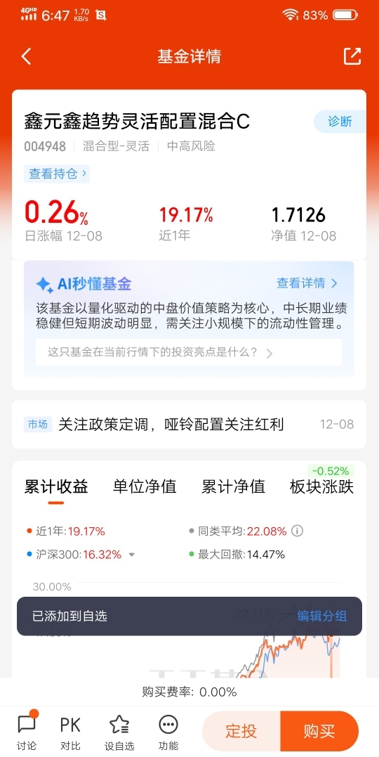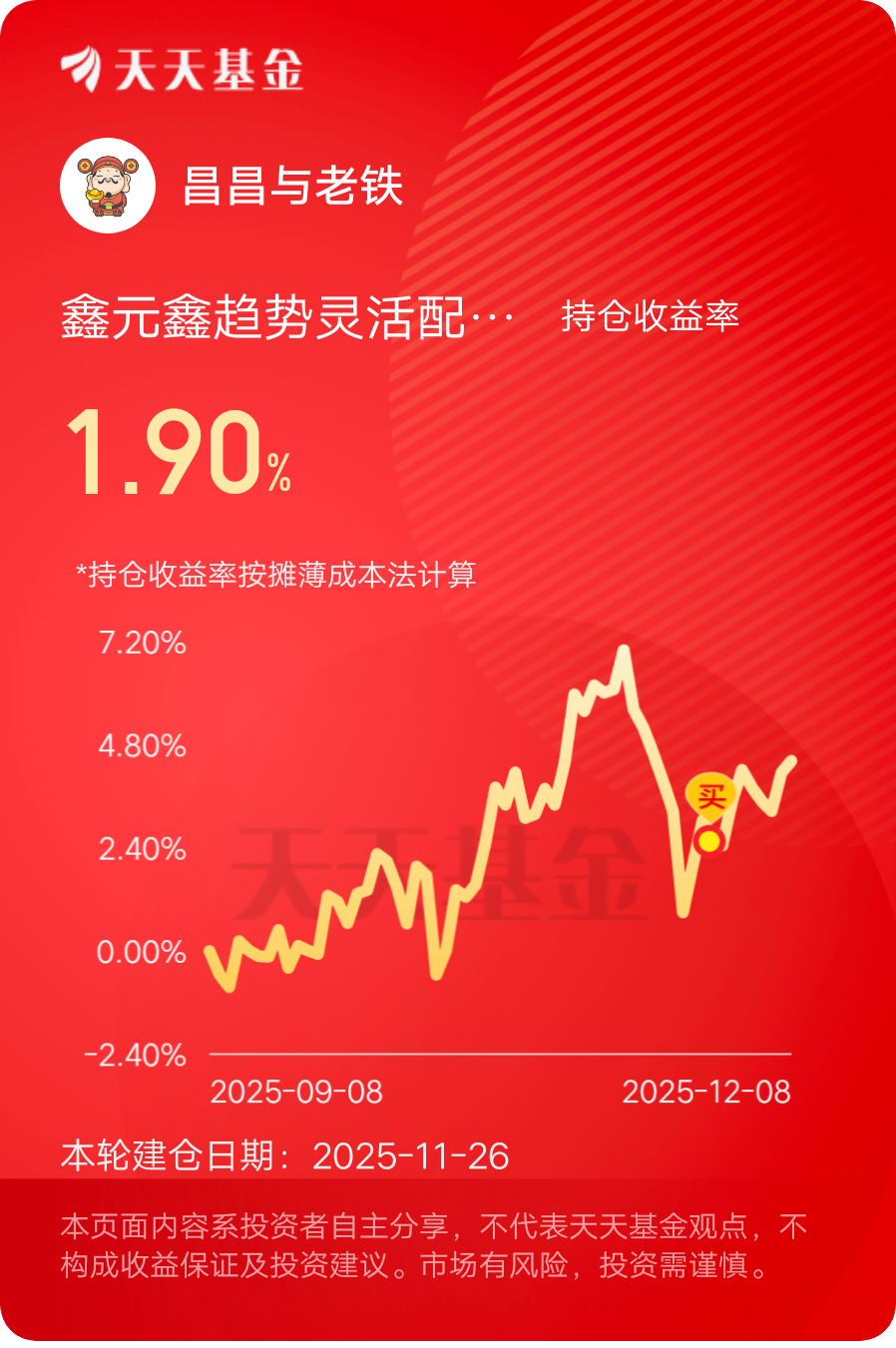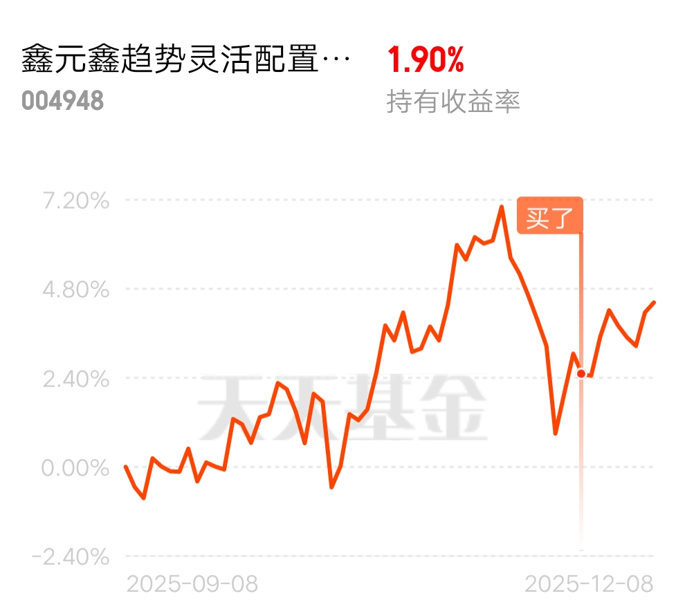 对于年末配置,我计划继续加仓$鑫元鑫趋势灵活配置混合C$ ,将其作为核心持仓。一方面,基金坚持以绝对估值股票为基石,能有效降低组合波动;另一方面,精选的相对低估成长股又能博取收益弹性,刚好匹配年末市场“稳中有进”的潜在格局。同时,我也会关注基金的行业配置动态,相信在量化模型与主动研究的双重加持下,基金能持续挖掘优质赛道的投资机会。