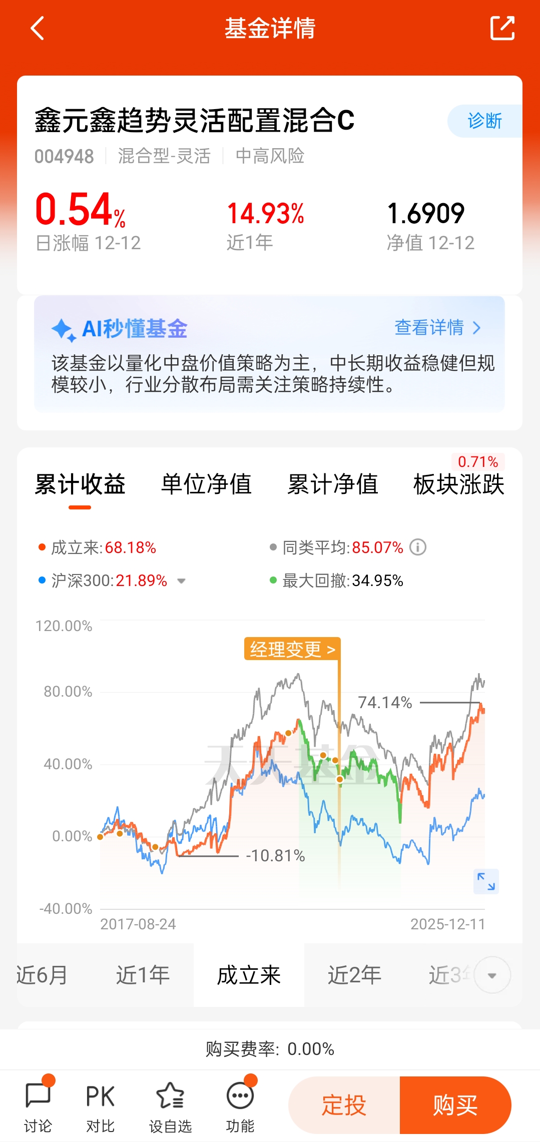 从2025年第三季度持仓中,我们可以查询到前十重仓的行业配置均衡,相对有成长性的公司,市盈率基本上在二三十倍之间。刘宇涛基金经理的投资策略体现在了持仓上面。基金业绩曲线做得很好。