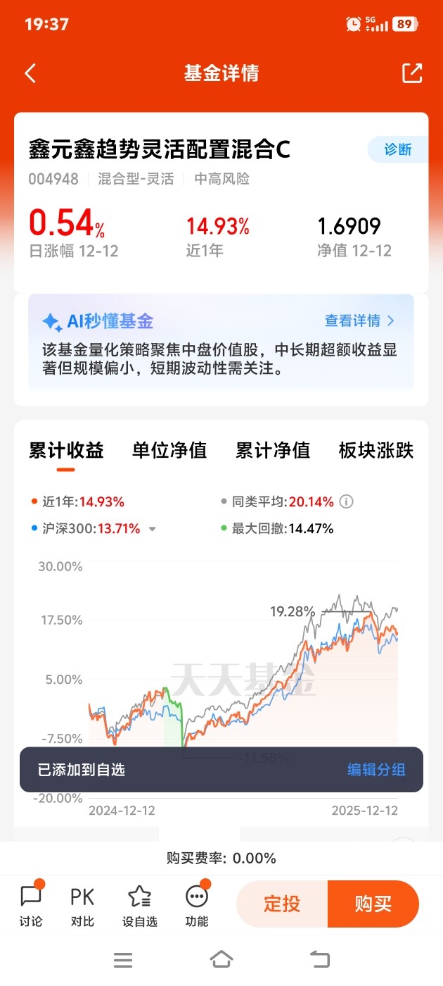 业绩表现印证了该策略的有效性,为年末配置提供扎实支撑。截至2025年12月12日,鑫元鑫趋势C过去一年净值增长率达14.93%,大幅跑赢超10%的业绩比较基准,超额收益达5%以上;自2017年成立以来累计净值增长率69.09%,显著超越同期业绩基准25.80%的表现,长期收益能力稳固。从风险维度看,基金过去一年波动率为1.48%,虽略高于基准但显著低于纯股票型基金,风险收益比优势突出。在年末行情中展现出较强的收益弹性与抗跌性。作为混合型基金,其业绩比较基准设定为沪深300指数收益率×50%+上证国债指数收益率×50%,天然具备股债平衡的属性,与投资者“权益打底、稳健优先”的配置逻辑高度契合。