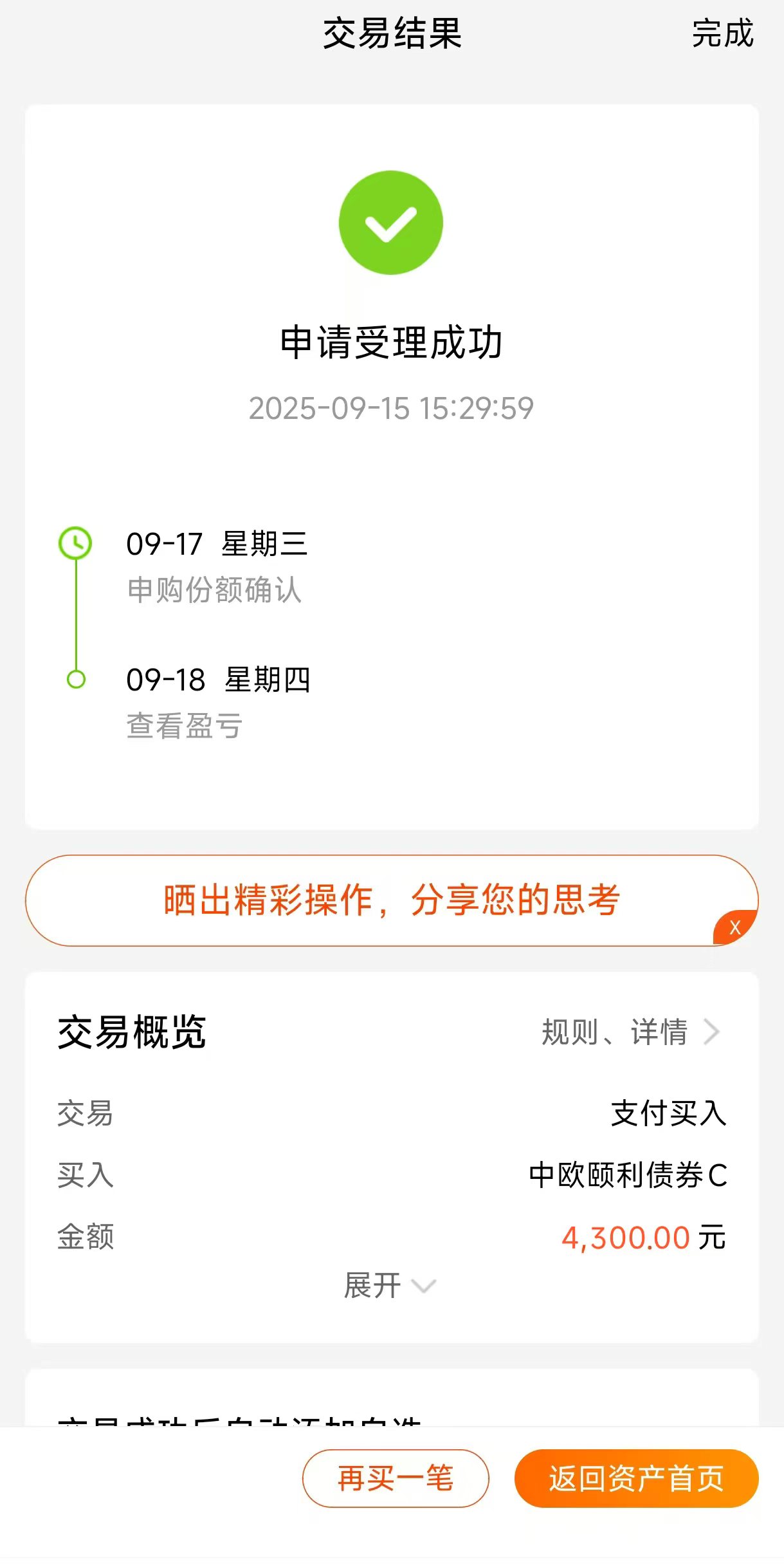 在低利率环境下,资产配置需要多考虑一层。$中欧颐利债券C$(016851)以债券投资为主,寻求稳健收益,同时增加股票投资,以期分享市场可能出现的机会。我认为这种产品更适合作为理财底仓。观察到近一个月,其净值走势较为平稳,收了18个蛋,近一年的整体收益表现也令人满意,相比热门的鹏华丰禄债券(003547)这个月就碎了17个蛋,高下立判。而且中欧颐利高的机构持有比例,在一定程度上反映了专业投资者的认可。目前平台有满3W-30、满2W-20、满10W-10的红包,可以考虑布局。#锂电产业链爆发 宁德时代涨超10%#