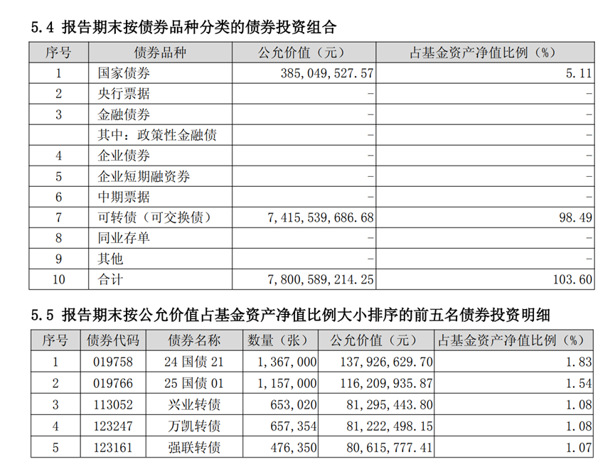 再次,看持仓。最直观的是其95%以上仓位放在可转债,可以算是“all in转债”。