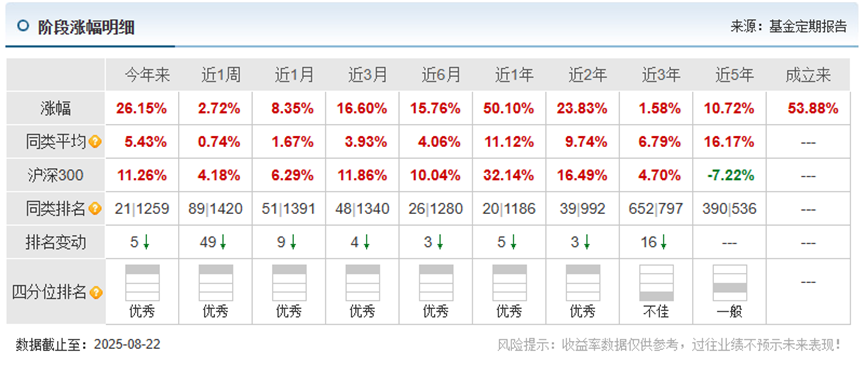 首先,看收益,以其C类004994为例看这几年的转债投资效果,作为几乎纯正的转债基的它,业绩表现近两年以来一直稳定在同类头部。现任基金经理李波是自2024年2月开始接手的,近一年涨幅超过50%,今年以来26.15%的涨幅暂时也超过了很大一部分主动管理的股基。