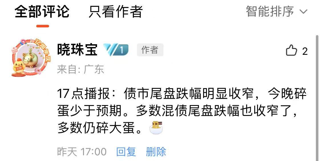 注意,如果播报后,债市尾盘拉升或者跳水,17点左右我会在估值帖子的评论区更新情况。