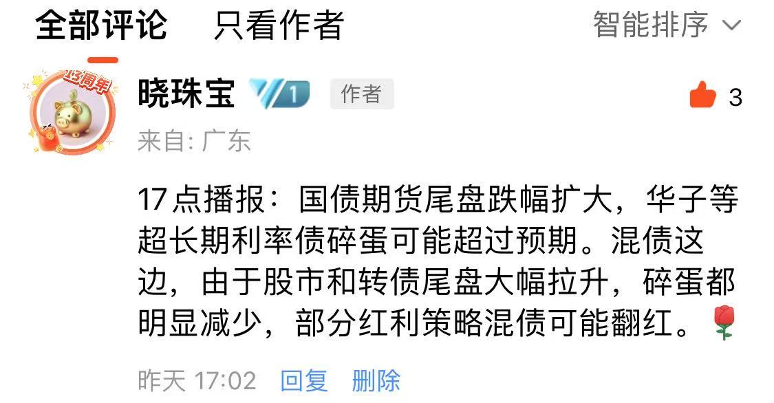 注意,如果播报后,债市尾盘拉升或者跳水,17点左右我会在估值帖子的评论区更新情况。