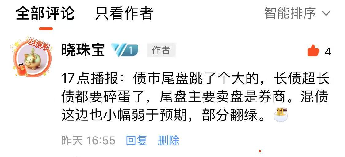 注意,如果播报后,债市尾盘拉升或者跳水,17点左右我会在估值帖子的评论区更新情况。