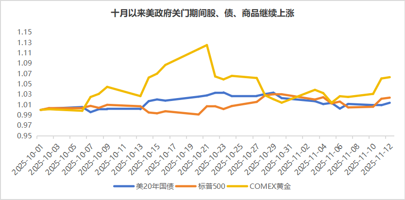 重新开门后的利好主要包括(1)美元流动性的投放、(2)美国经济数据披露工作的正常化,减轻了12月由于经济数据原因带来的降息不确定性。但虽然美政府关门期间一度导致全球流动性担忧对市场带来扰动,但截至12日,美政府关门以来美股、美债和黄金期间分别上涨2.43%、1.56%和8.07%,市场对以上利好已经有一定程度的定价。(信息来源:wind)