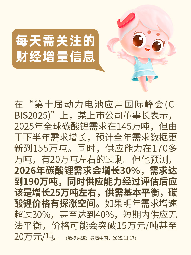 【每天需关注的财经增量信息】2026年碳酸锂需求会增长30%,需求达到190万吨