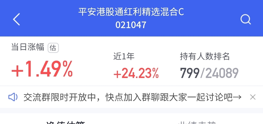 今天权益市场继续震荡了,这波红利涨幅还是很不错的,来看看这几只今天估值直接大涨$平安港股通红利精选混合C$ 估值大涨1.49%,厉害!