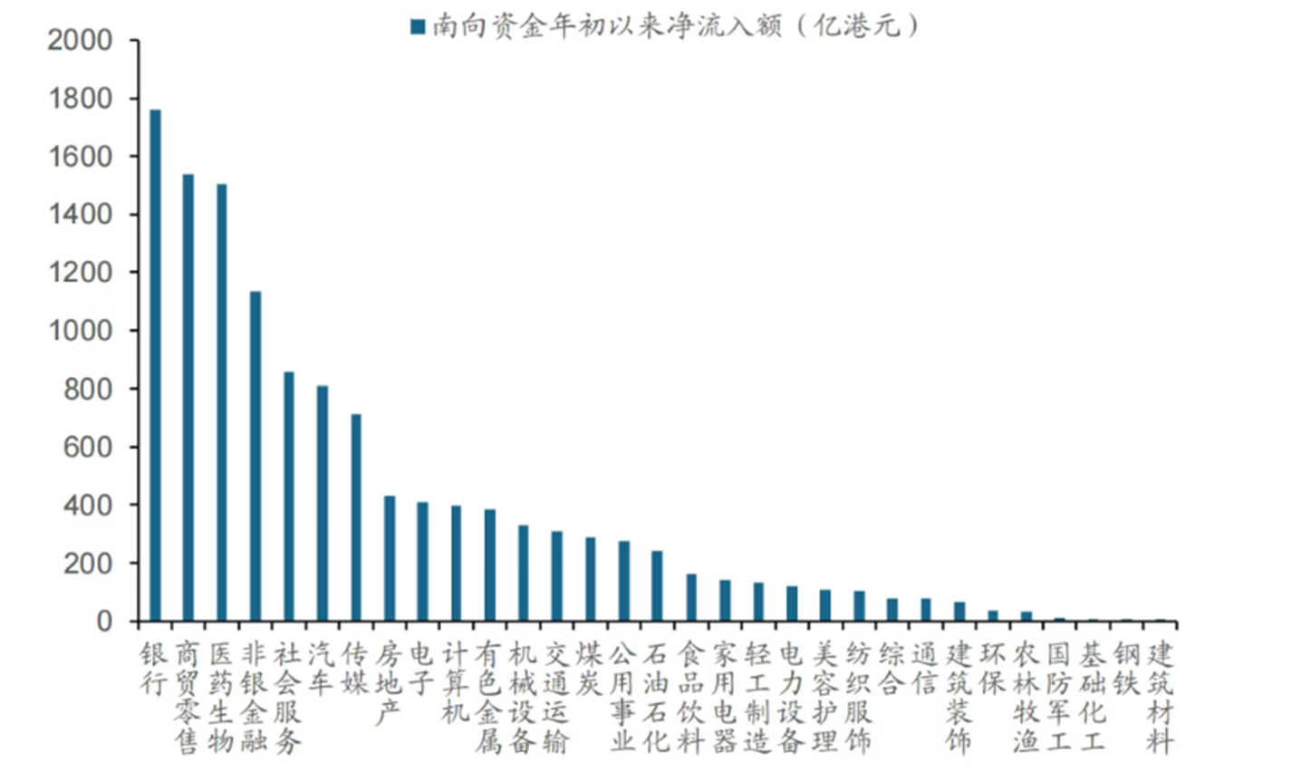也正是在港股折价率的相对优势之下,南向资金加速入场。24年初至今南向资金出现明显放量,924以来进一步加速。25年前9个月南向资金净流入达11675亿港元(2024全年为8079亿港元)。分行业看,年初以来南向资金主要流向银行、保险等高股息板块,以及商贸零售、医药等消费板块。