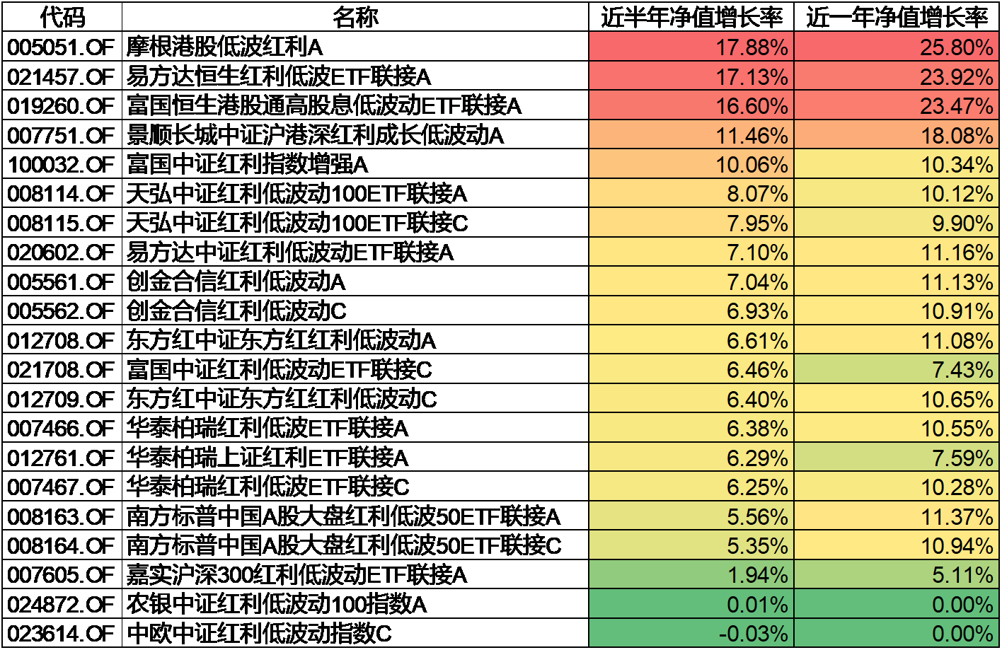 综合来看,虽然红利板块目前并非市场焦点,但从性价比和胜率角度上,红利资产可能仍然有着相对优势。这其中,$摩根标普港股通低波红利指数C(OTCFUND|005052)$(005052),近半年收益率高达19.79%,今年以来收益率更是达到23.30%。这只基金成立于2017年底,是老将了,目前规模20亿元左右,船小好调头。相较于华泰柏瑞红利低波ETF联接C(007467),近半年收益率只有5.75%,今年以来收益率仅为1.82%。同样是红利基金,业绩差距咋就这么大呢?最后看$景顺长城沪港深红利成长低波指数A(OTCFUND|007751)$,近半年收益率为11.32%,今年以来收益率为11.78%。业绩居中,但依然被摩根甩开一大截。