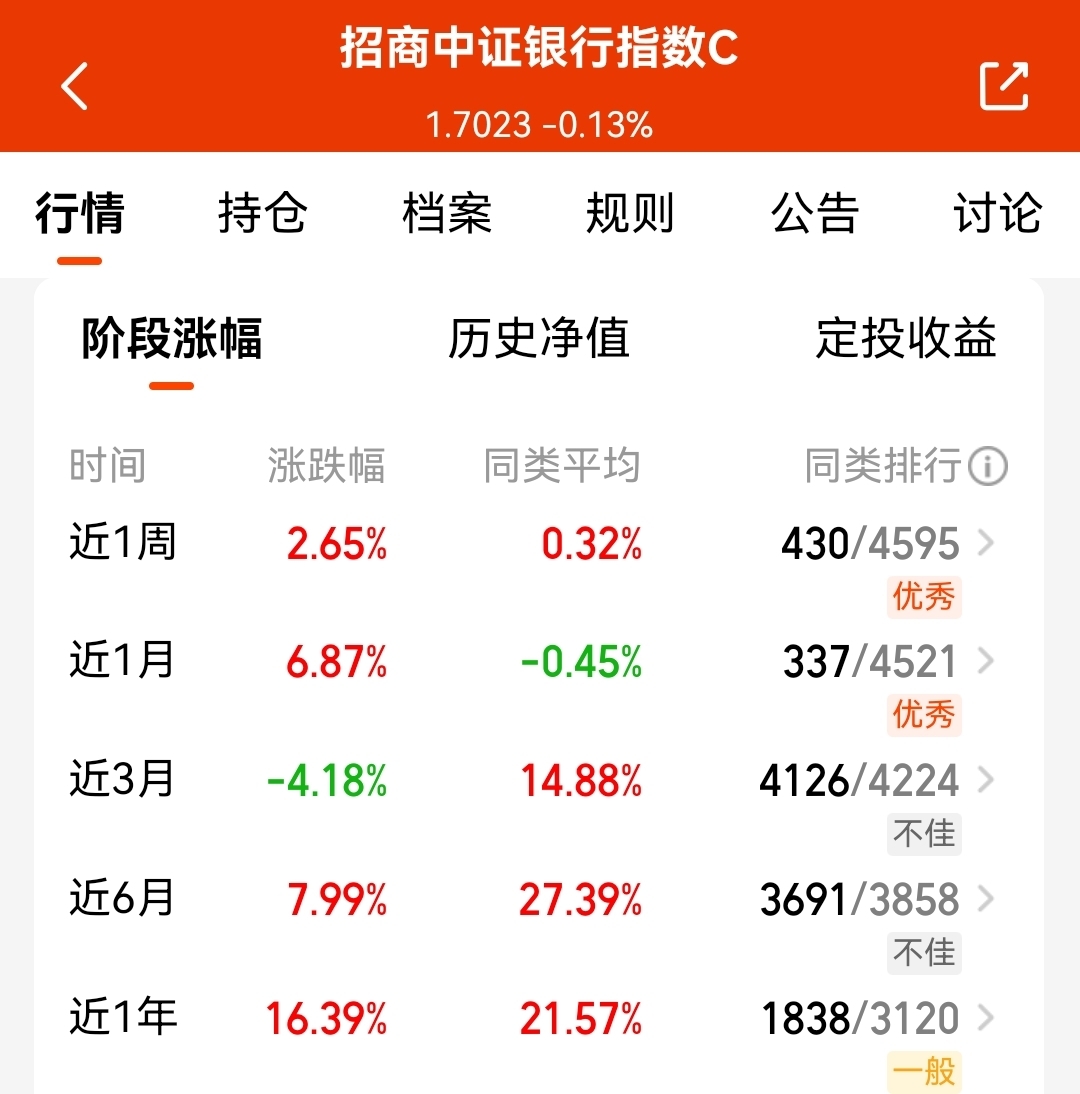 考虑防守,我还是看这支$招商中证银行指数C$ ,跟踪银行板块,今天也是逆势护盘为主;