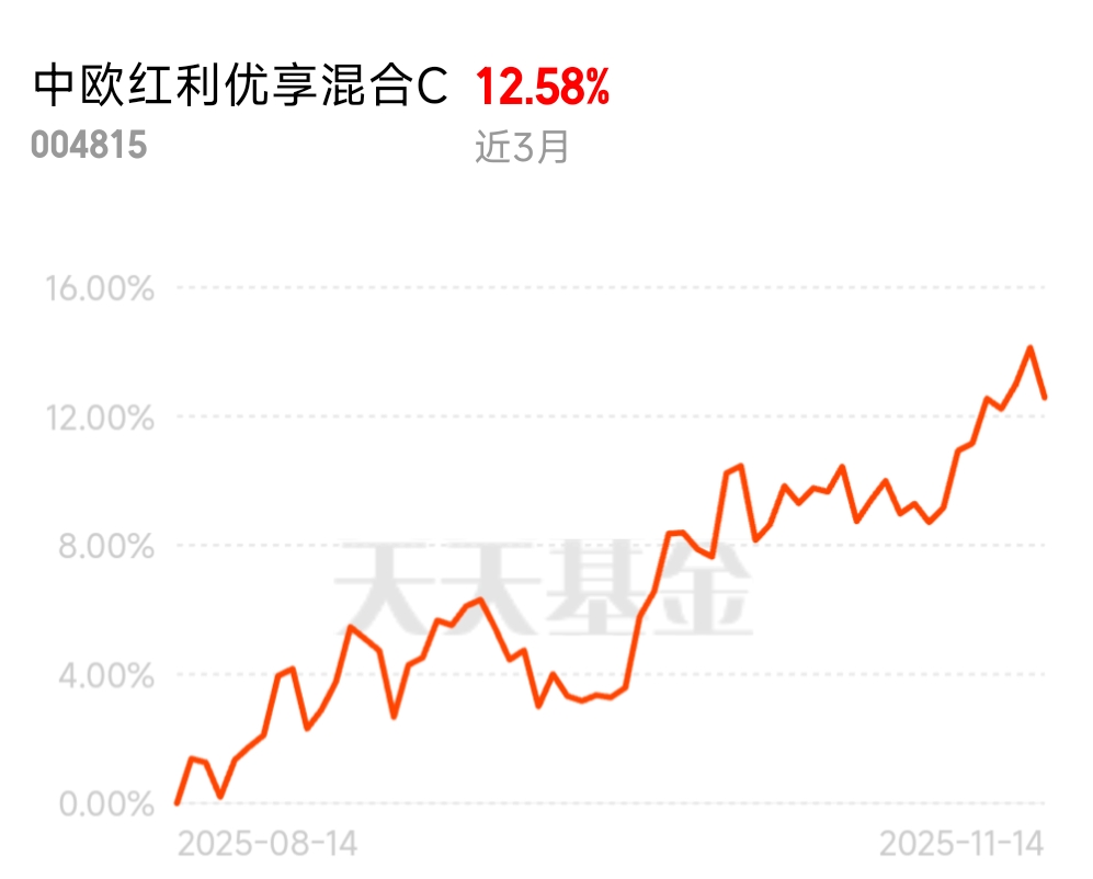 最近市场来回震荡,好多板块涨一天跌一天没个准头,想找稳当的去处真不容易。中欧红利优享灵活配置混合C就挺靠谱,近3个月涨了12.58%,高股息低估值的红利资产抗跌,经理还能主动避坑,当底仓再安心不过,满2万减36的加仓红包也挺实在。
