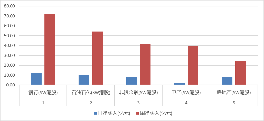 说到红利资产,除了A股之外,港股红利可能是个更具性价比的选择。一个原因就是港股股息率普遍高于A股红利资产,因其港股普遍分红比例更高,而且同一公司的H股股价通常比A股低,也就是常说的“港股折价”,这就变相提升了股息率。也正因此,不少南向资金近期已经快速流入港股红利板块。根据WIND数据显示,上周五南向资金净买入前五的行业板块中,红利属性的就占了3个,其中银行更是以12.27亿元占据第一,周度数据亦是如此。
