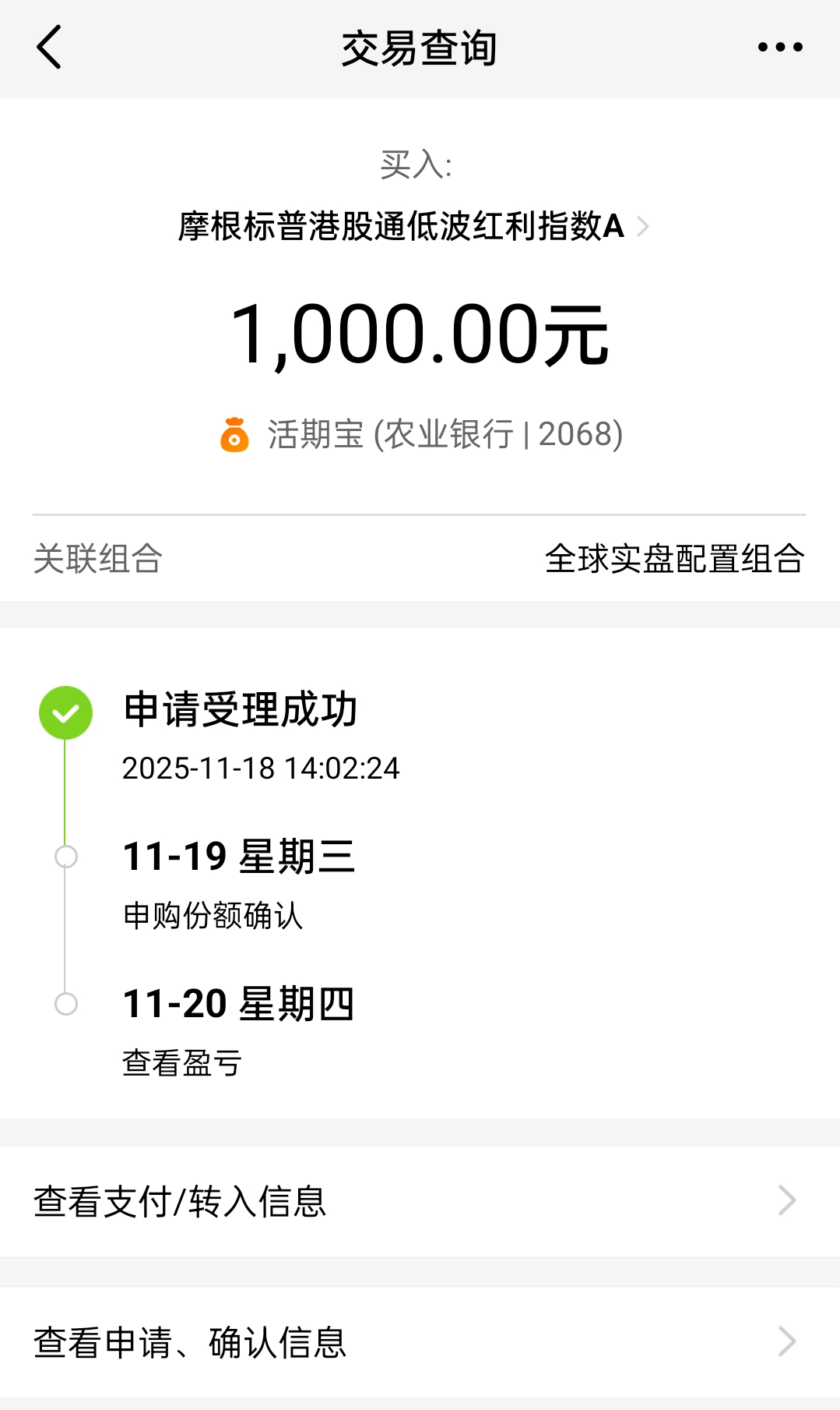 在市场方向未明、震荡加剧的当下,咱们不妨多关注一下这类“攻守兼备”的红利资产。它不仅能够提供持续的现金流回报,还能在市场下跌时提供更好的保护。$摩根标普港股通低波红利指数A(OTCFUND|005051)$作为全市场规模最大的港股红利基金,已经成为机构和散户配置港股红利的首选工具,其稳定的创新高能力和良好的持有体验,让它在当前复杂多变的的市场环境中显得尤为珍贵。趁着四季度分红密集期,布局一些这样的资产,或许能为明年的投资收获打下坚实基础。