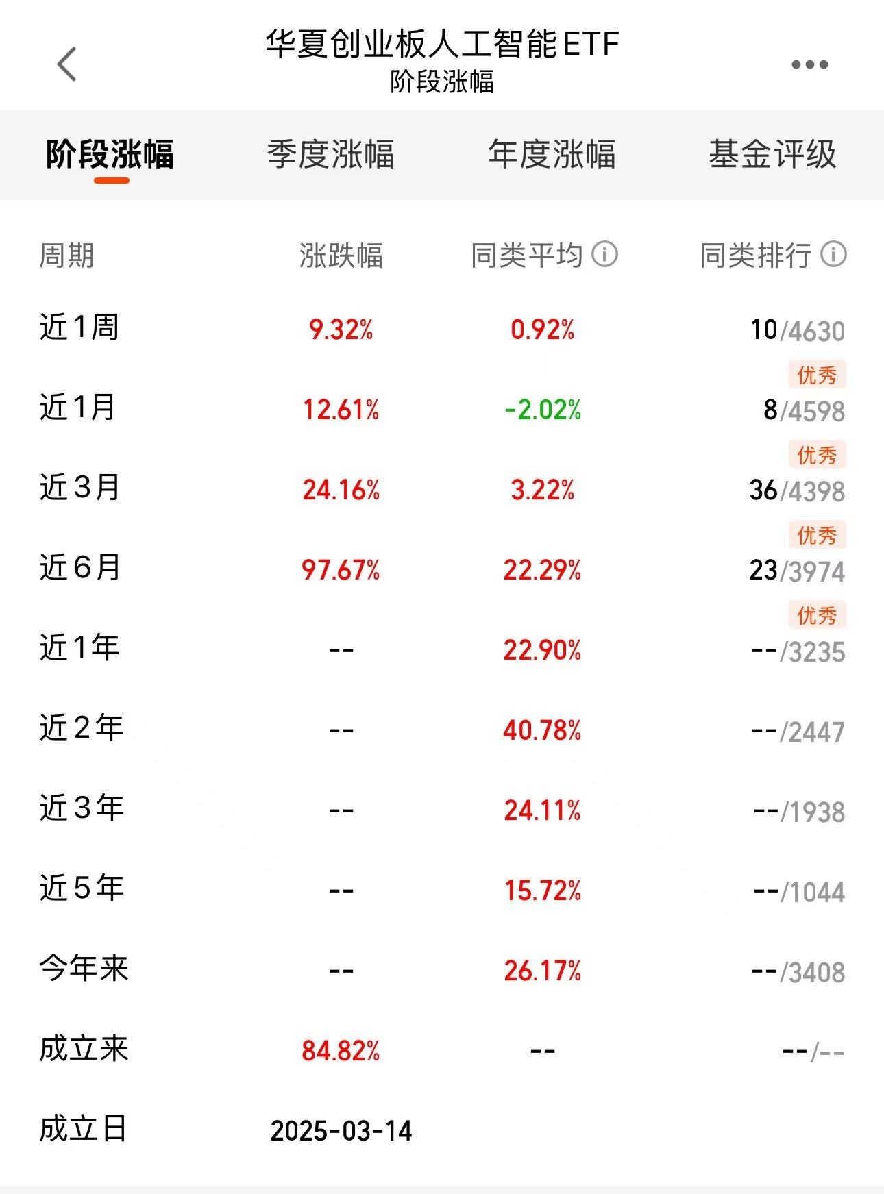 持仓收益太亮眼了,场内近一周和近一个月收益都是同类前十,今天估计是5连涨了,$华夏创业板人工智能ETF发起式联接C$打算看长期