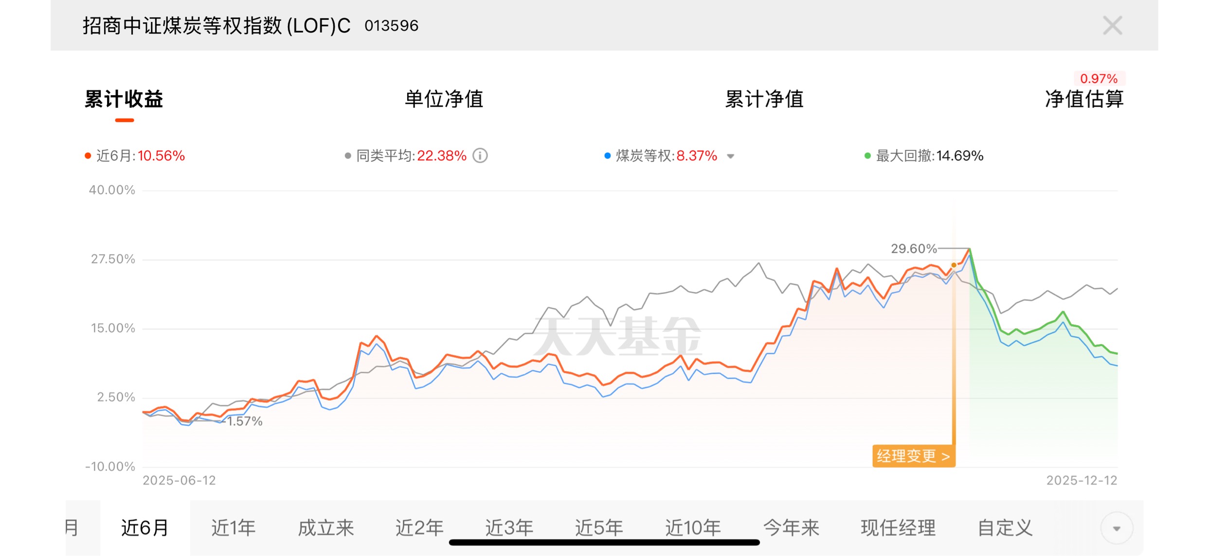 四季度周期股投资主线指向煤炭,重要会议明确能源强国方向,之前的低估值优势还在。招商中证煤炭等权指数 (LOF) C 近 6 月收益 10.56%,等权分散风险能力强,冬季工业用煤 + 居民采暖齐增,后续表现可期。