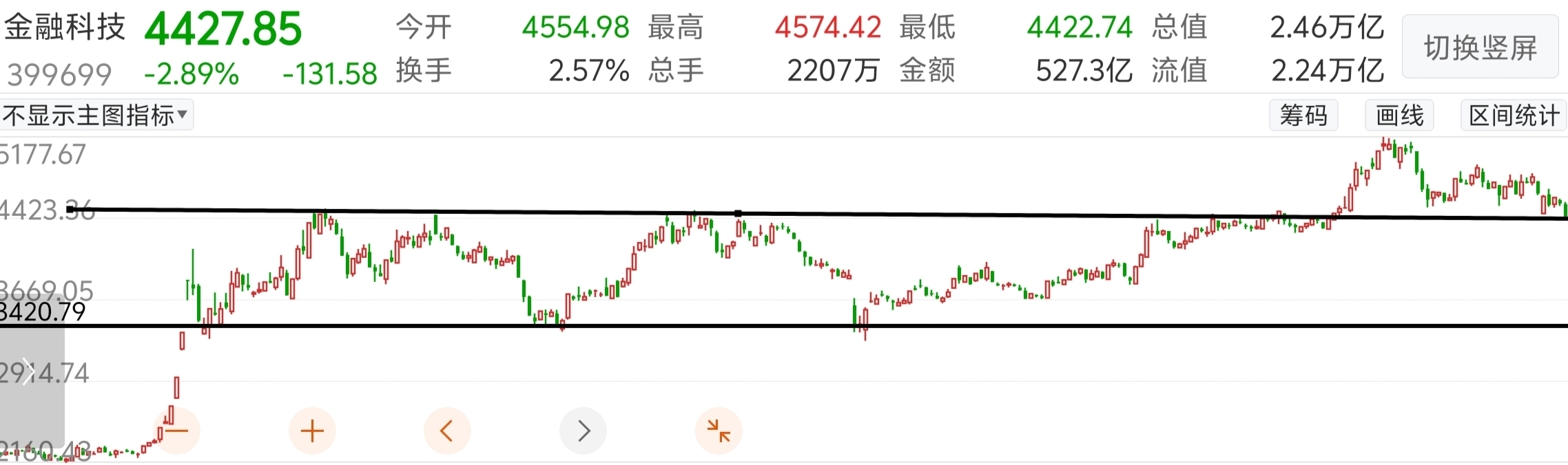 金融科技回踩了箱体上沿。。这个箱体是去年924行情做的,今天回踩了。如果能守住,