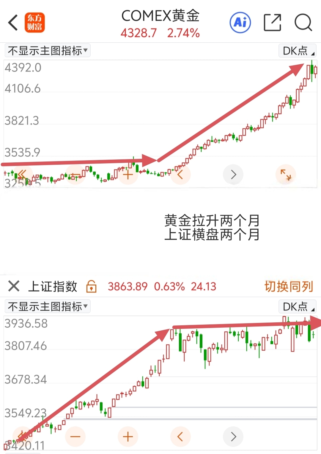 上证8月25号至今一直横盘,这期间 黄金一直大涨。。