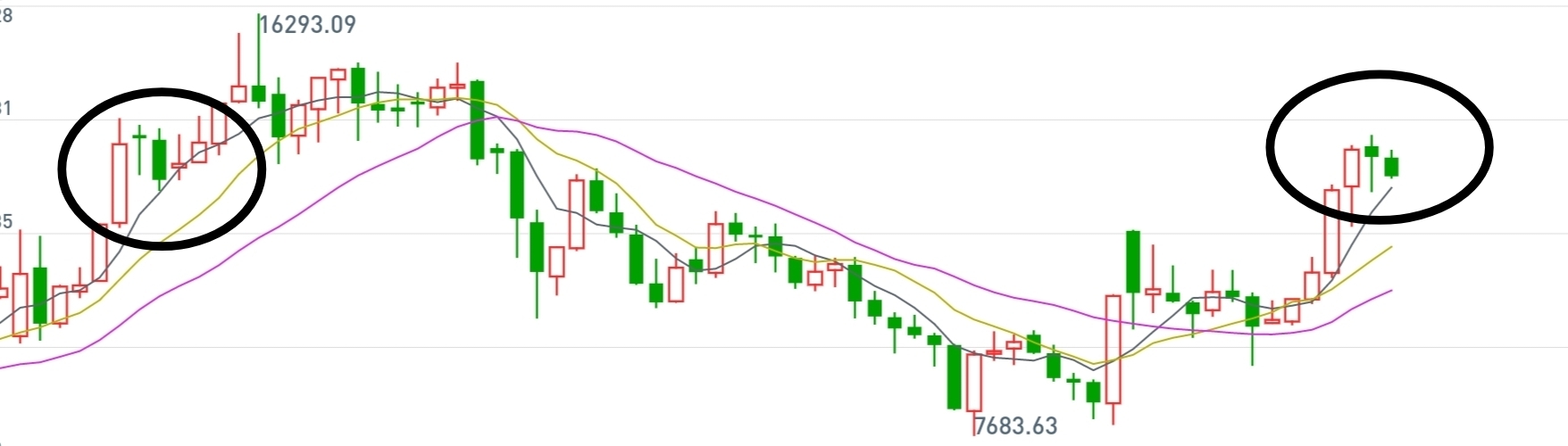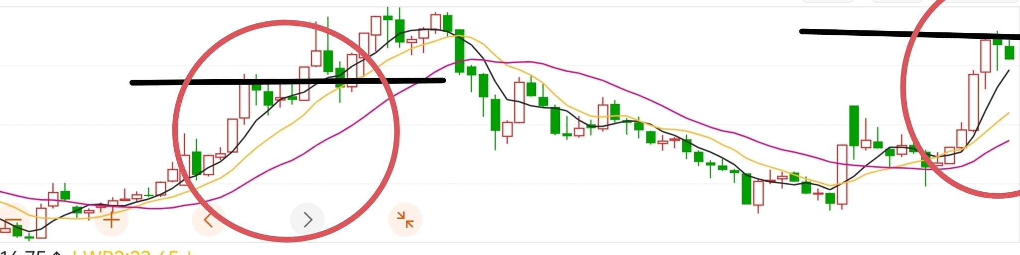 连续四个阳线,远离五月线,向五月线靠拢。 突破黑线,新一轮上涨。。 现在也一样,向着五月线靠拢,出来了一个黑色压力线。。突破了又是一轮大涨。。