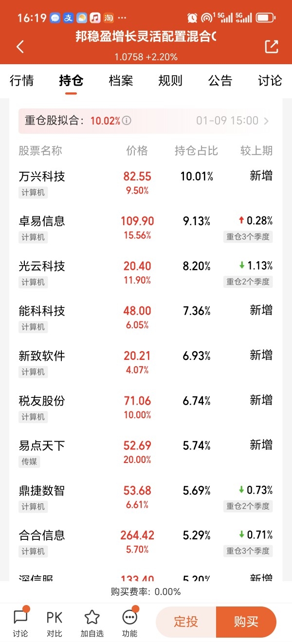 这只基金今天持仓股普遍涨幅巨大。我加权平均的算了一下,综合涨幅是9.842%。