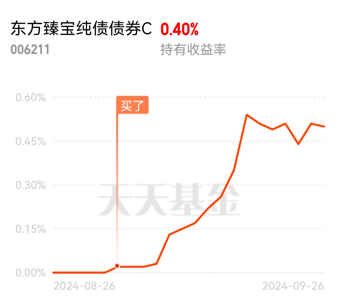债基收益以及行情回顾:股市收盘前站到3000点,一片欢腾,但是债市却遭遇打击。出现大跌,尾盘 10 年期国债朝着 2.1 杀去,晚间收于2.095。我个人而言,债市的波动是正常现象。在经济形势不断变化的背景下,我们需要保持冷静和理性。债市的调整也可能带来一些投资机会,对于风险偏好较低的投资者来说,可以在适当的时候进行布局。$东方臻宝纯债债券C$