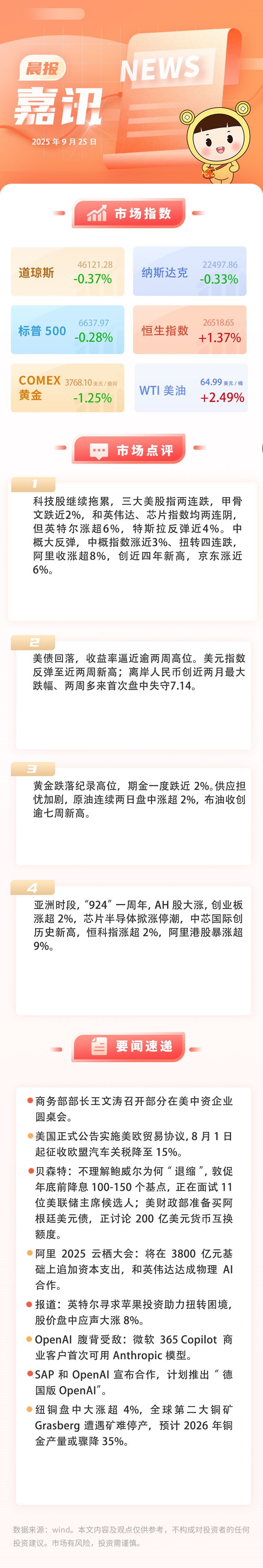 9月25日嘉讯:三大美股指两连跌,黄金跌落纪录高位