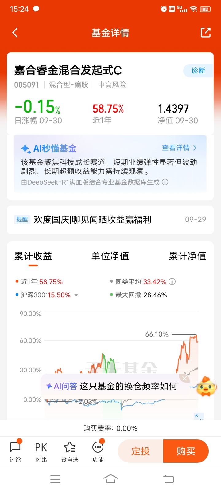 再说我的投资计划。在旅行中放松的同时,我也没落下对投资的关注。看好嘉合睿金混合发起式C,是因为它近1年58.75%的收益远超同类平均的33.42%和沪深300的15.50%,在科技成长赛道上爆发力很突出。虽然它波动剧烈,最大回撤28.46%,但作为聚焦科技成长的混合型基金,短期业绩弹性显著,长期来看,科技赛道的技术迭代和政策红利也给了它充足的成长空间。