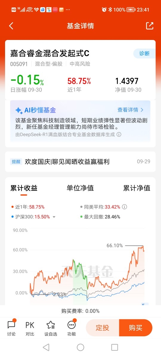 #分享国庆见闻,晒收益,瓜分好礼!# 祝大家国庆中秋快乐,长假休息,主要在家门口的公园绿地散心,鲜花盛开,流水小桥,真是鸟语花香啊!参加朋友聚会,共叙友情!闲暇之余考虑理财,看好$嘉合睿金混合发起式C$ ,投资科技板块,人工智能,算力等行业!$嘉合锦程混合C$ $嘉合锦鹏添利混合C$ @嘉合基金