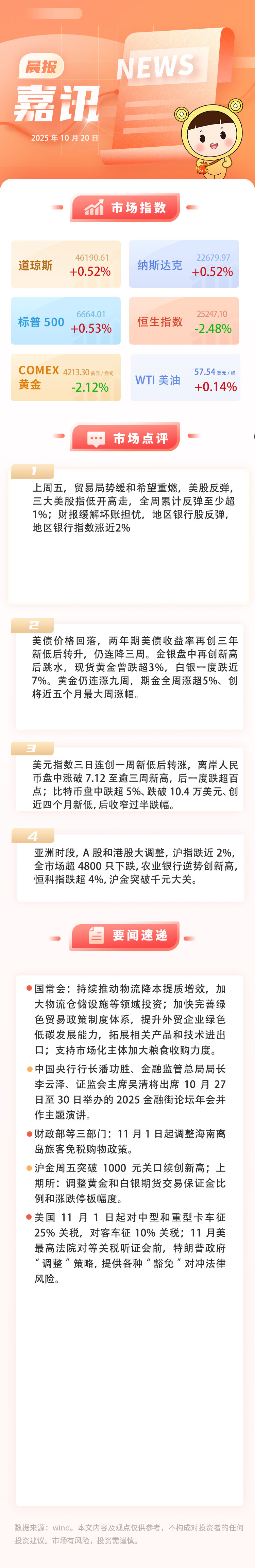 10月20日嘉讯:地区银行股反弹,美债价格回落
